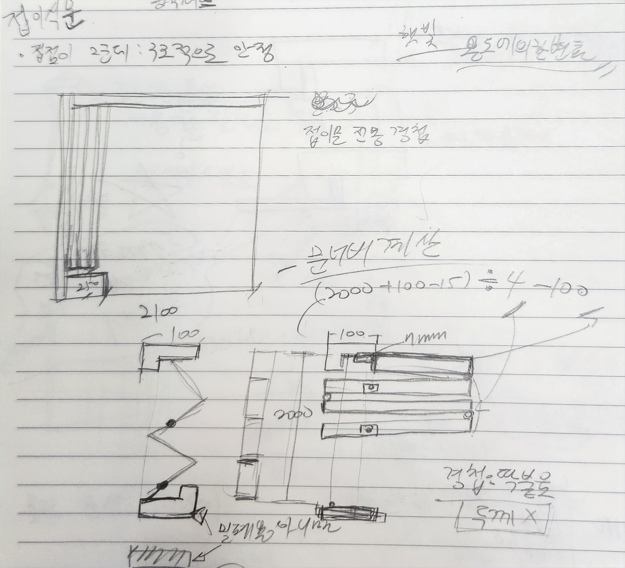 - 접이식 문 너비 계산 예: 접이식 문 가이드가 100mm, 접이식 문이 들어갈 전체 너비가 2000일 떄, 문을 4장 넣으려고 함. 여유 간격은 한쪽이 7mm/반대쪽은 8mm 총 15mm, 접이식 문 경첩은 문이 펼쳐졌을 때 딱 붙게 되기 때문에 너비 고려하지 않음.