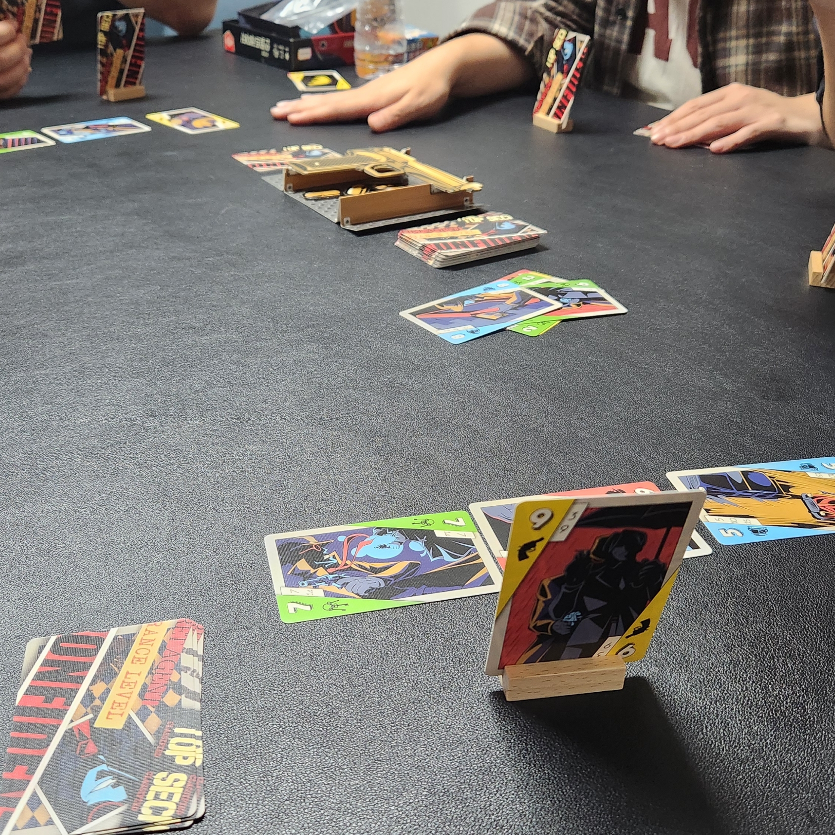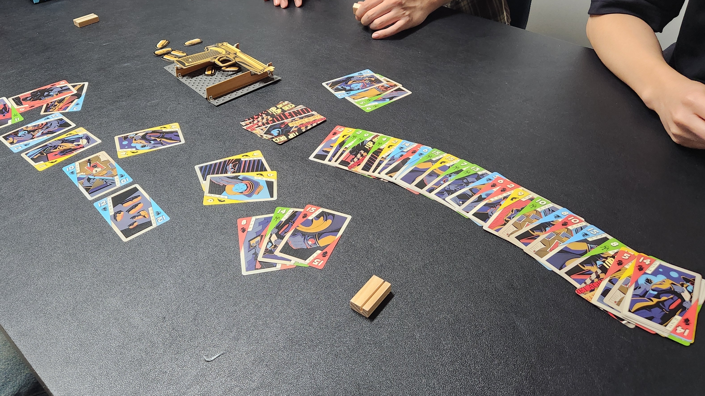 손패 카드를 범인 카드의 색과 숫자 중 하나라도 겹치는 게 있다면 세로로, 모두 틀리다면 가로로 두어 힌트로 줍니다.