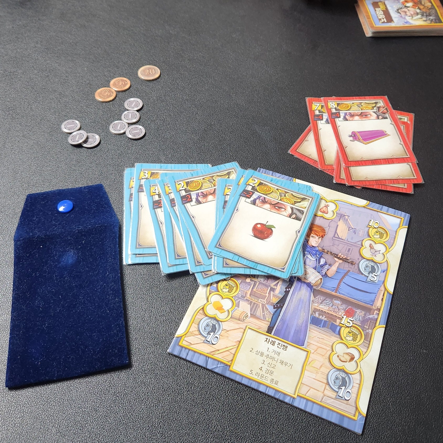 6. 통과된 물품 정리. 밀수품은 엎어둔다. 물품 최다 수입자는 최종 정산에서 추가점수가 있다.