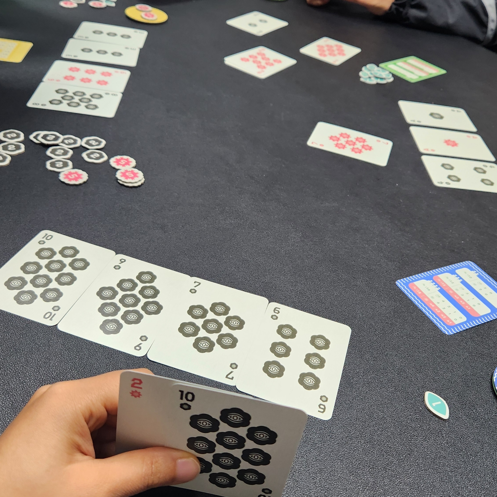 이 게임의 포인트는 손패 일부 공개와 배팅하기다.