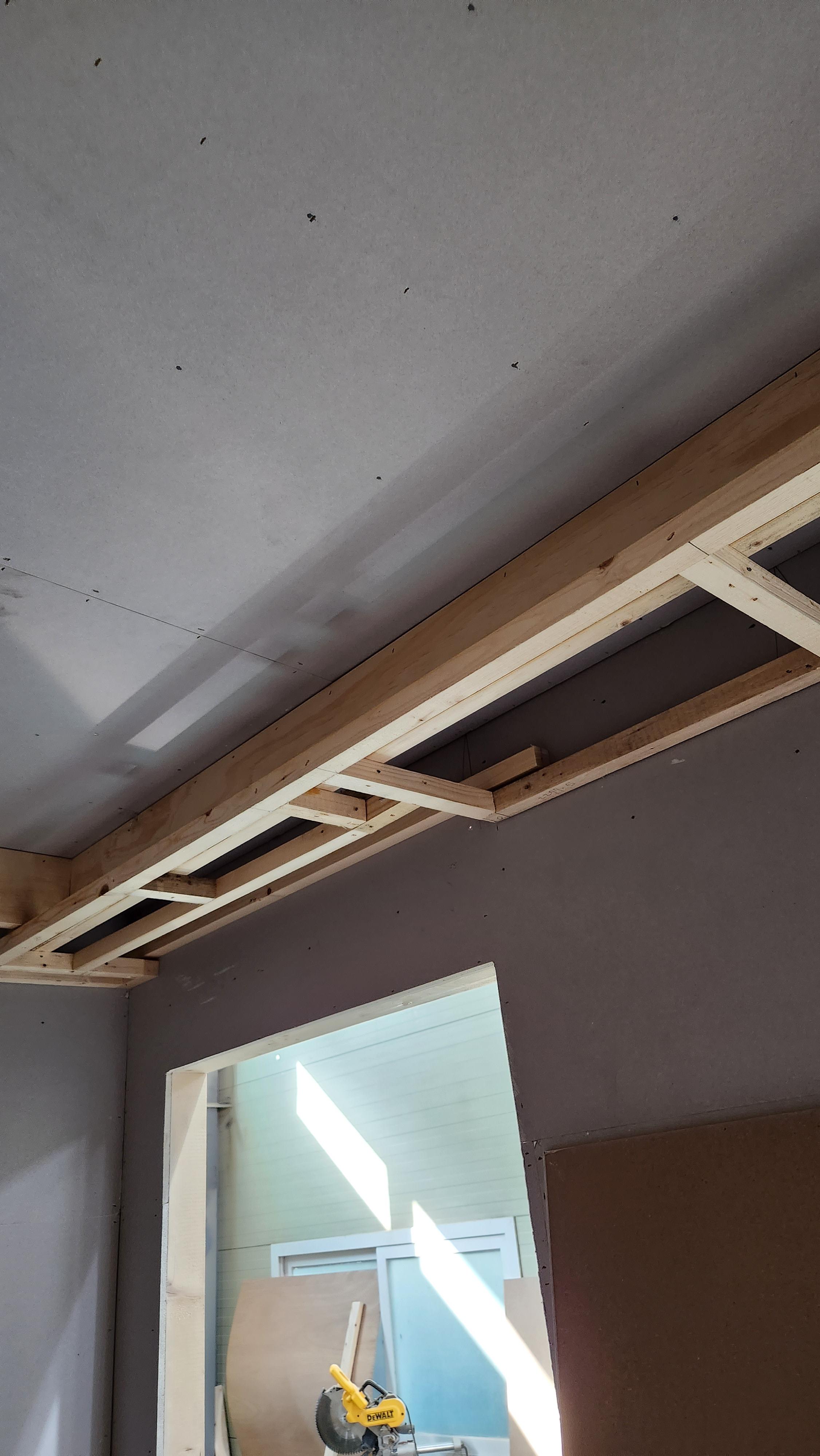 오늘은 우물 천장 짧은 쪽 틀을 만들어 붙이고 MDF로 커튼박스를 만들었다. 조명이 들어올 구멍을 뚫고, 우물 천장 틀에 석고보드를 붙인 후 바깥에 노출되어 보이는 우물 천장 벽 부분에 MDF를 붙여 마감을 했다. 마지막으로 문에 MDF로 문틀 마감을 조금 붙이다가 시간이 다 되었다.
