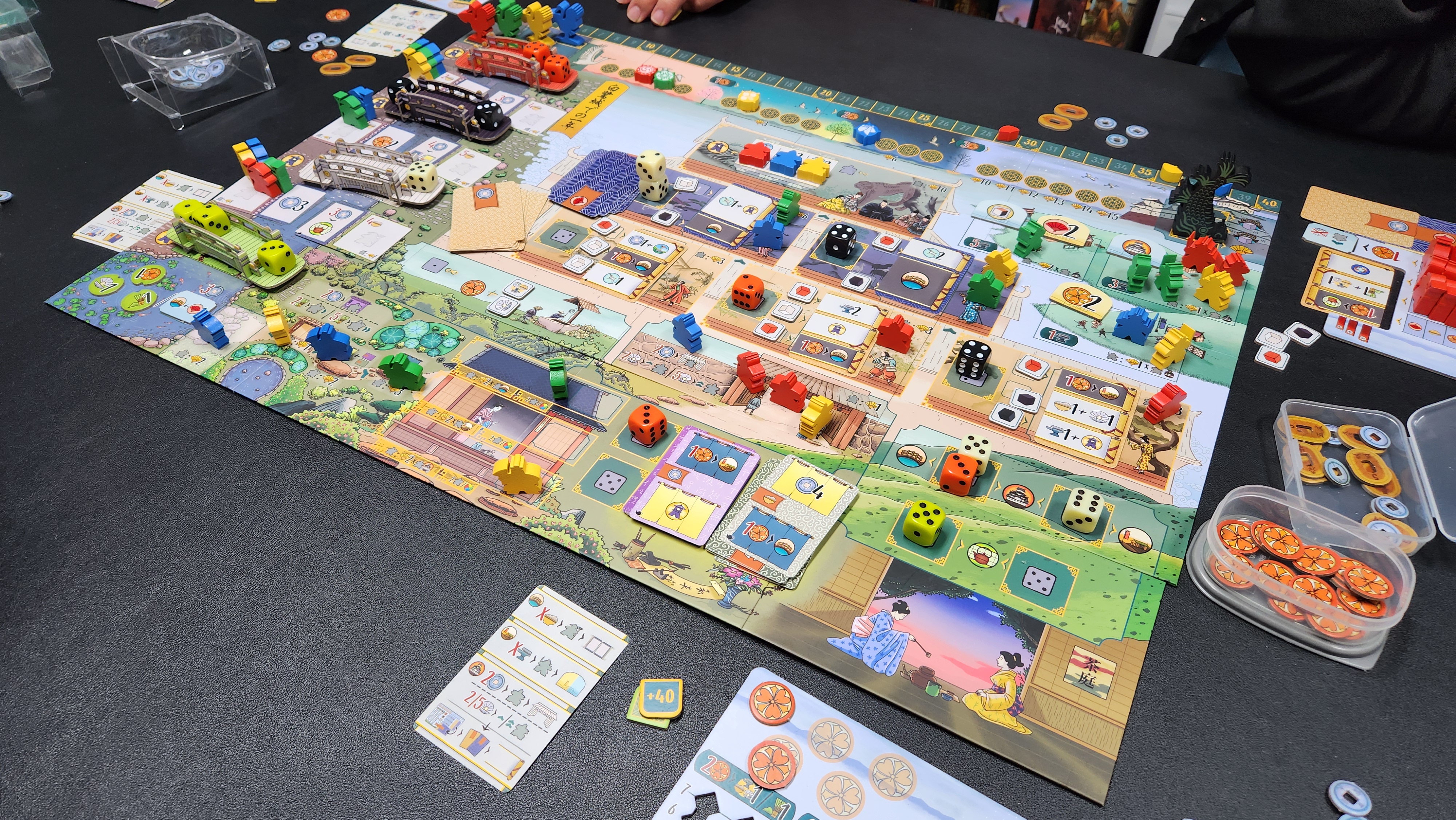 주사위로 자원과 미플놓기 액션을 벌고 가신, 정원사, 무사, 게이샤까지 여러 미플들을 놓아 최종 점수를 쌓아나가야해요