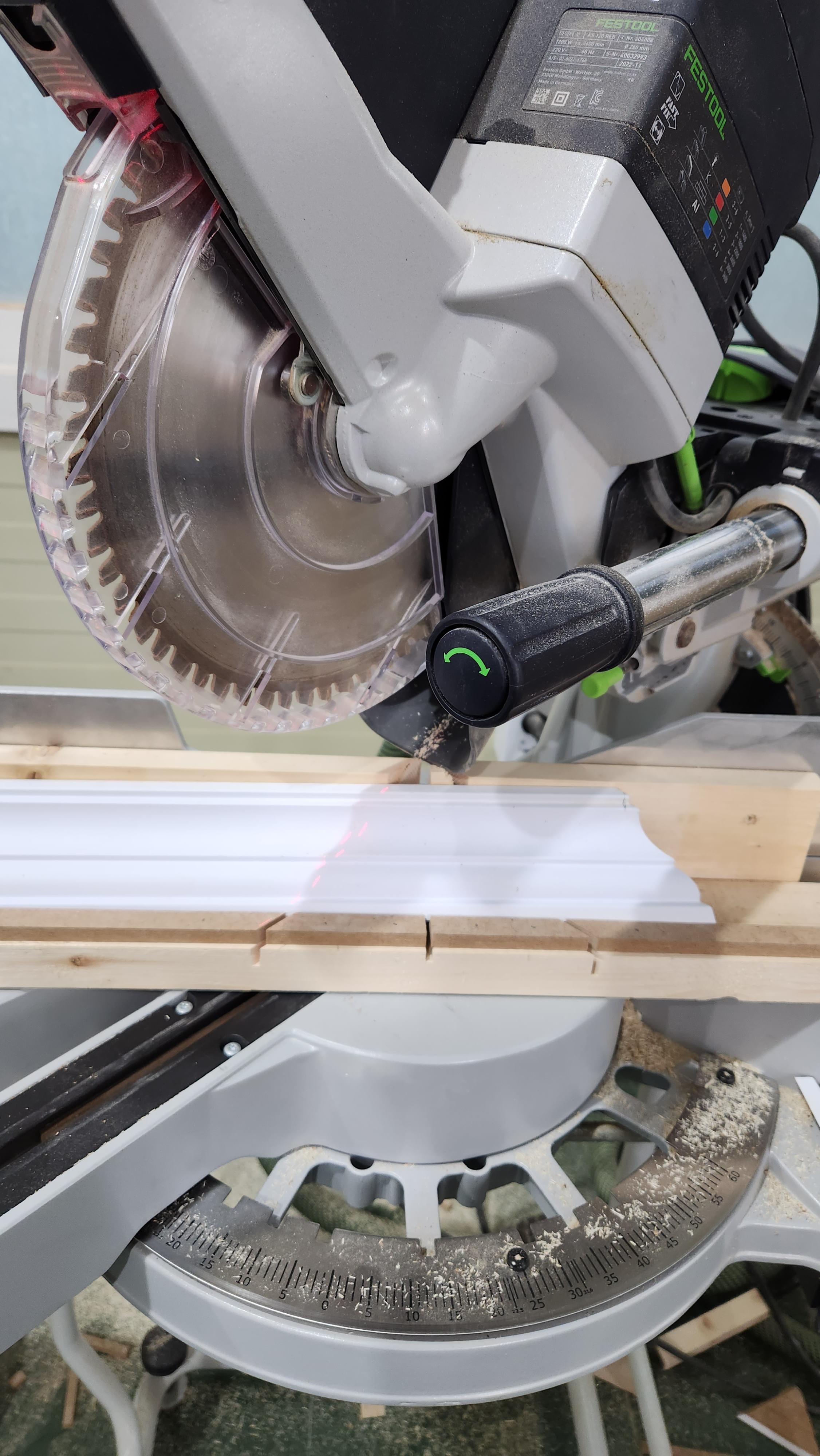 1. 각도절단기에 다대함을 피스로 고정하고 크라운 몰딩의 우묵한 부분(벽에 붙는 쪽)이 위로오도록 다대함에 놓아야 한다.