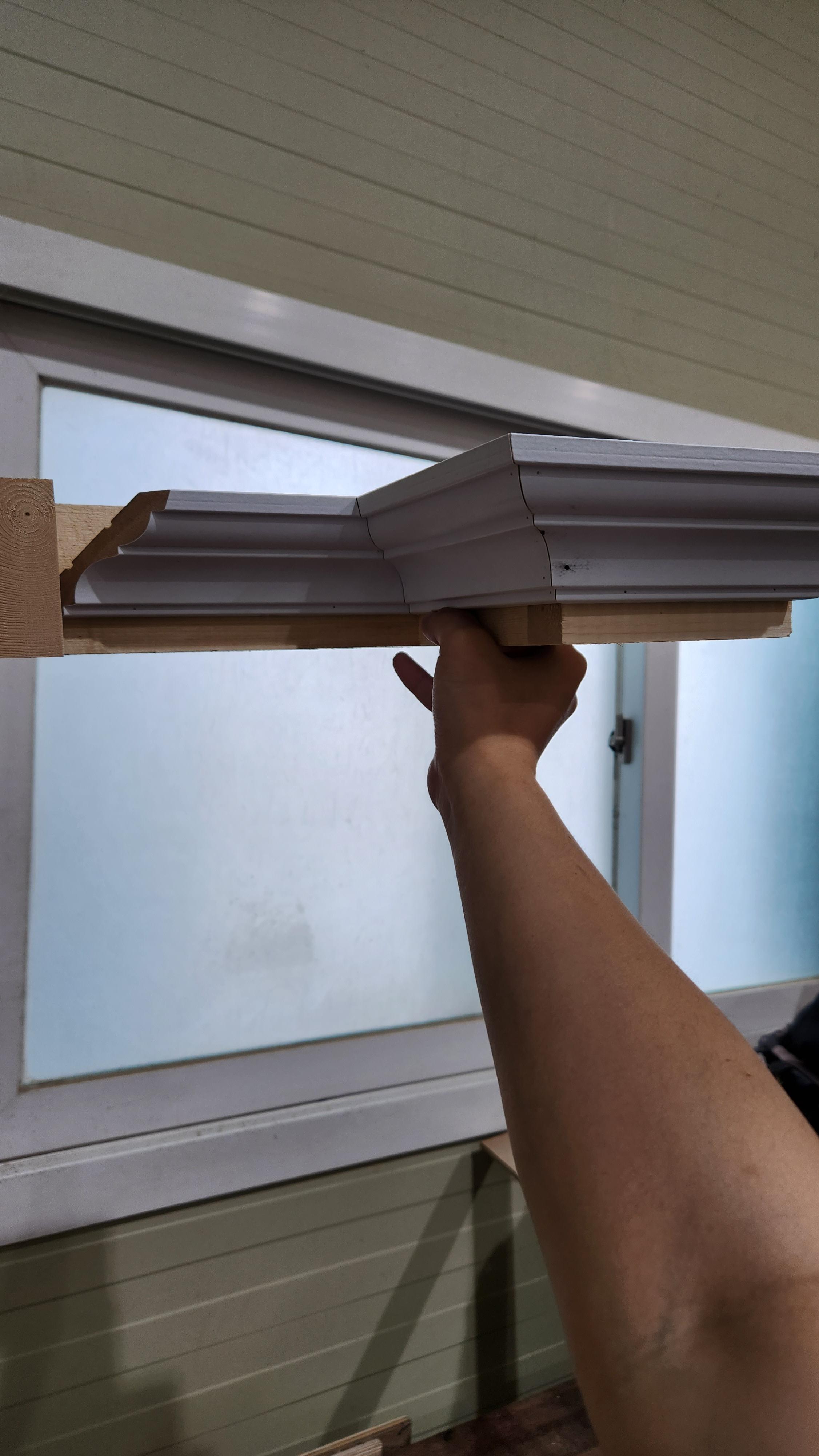 몰딩을 돌리기 위해 다루끼로 길이 잘 재놓고 다루끼를 잘못 맞춰서 몰딩을 잘못 잘랐다. 다행히 필요한 길이보다 길게 잘라서 다시 잘라 붙일 수 있었다.