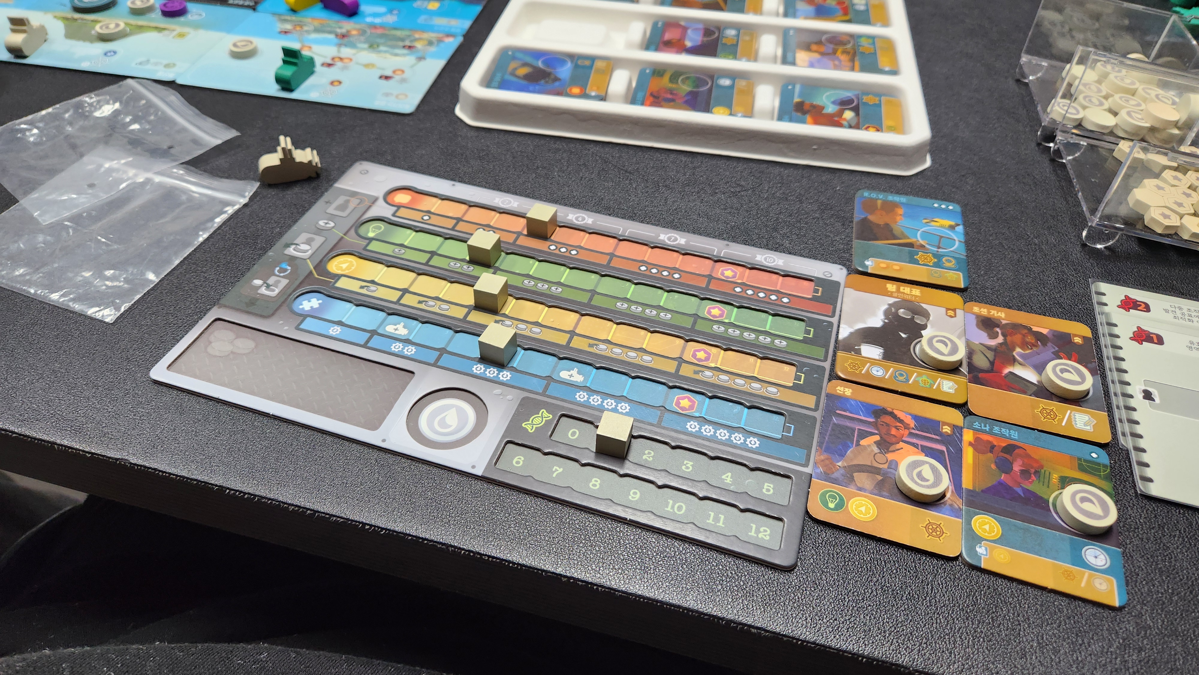 심해를 잠수정으로 항해하고, 소나로 미개척지를 열어나가고, 잠수해서 자원이나 행동을 얻고, 해양자원을 보존하며, 학술 연구도 해나가는 바쁜 일정이 6라운드에 걸쳐 진행되었읍니다