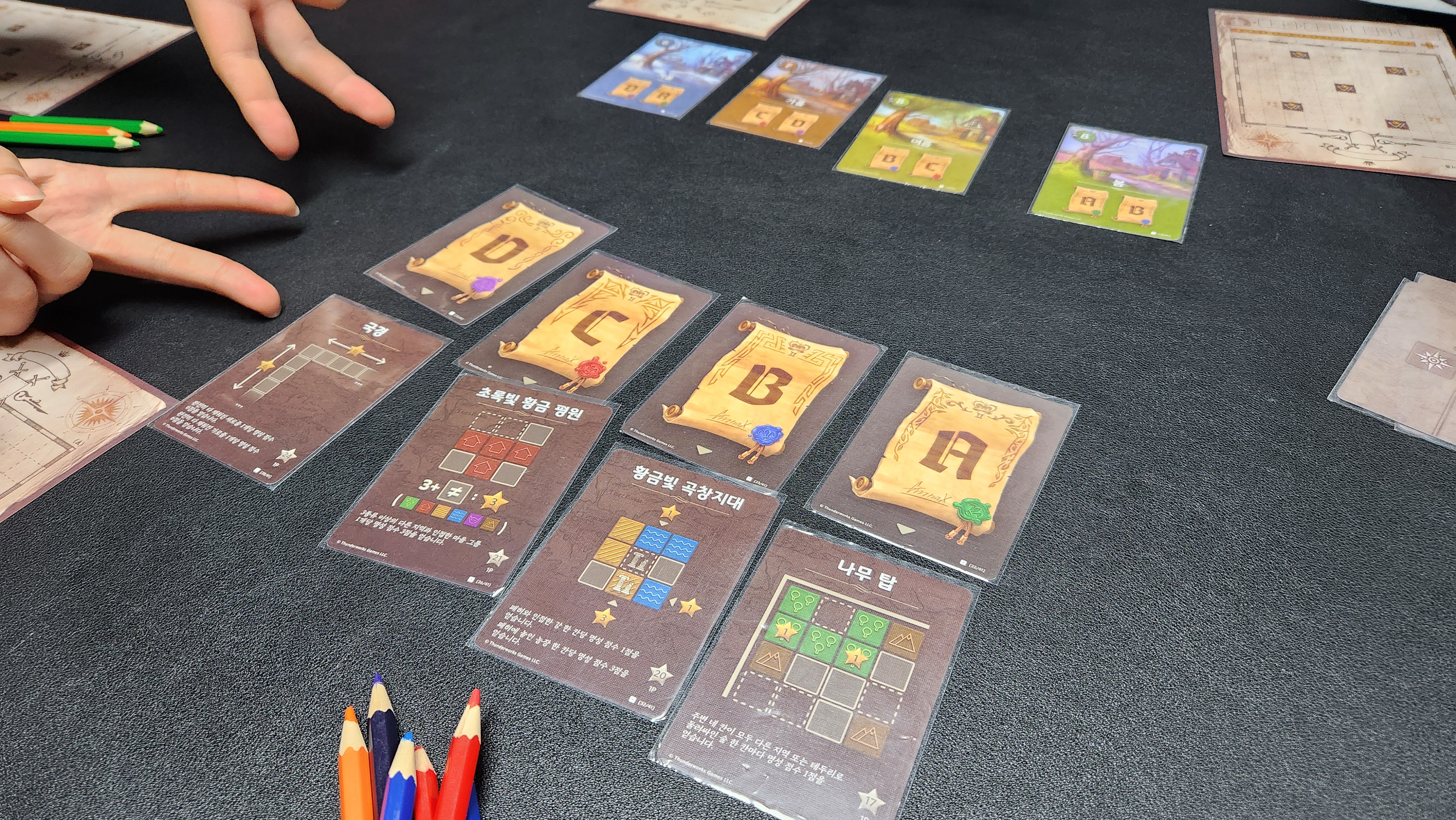 각 계절별 제한된 수의 카드를 뒤집어 나온 도형을 조건에 맞게 색색으로 지도에 그리면 되는 게임. 간단한듯 복잡한듯. 여러 색으로 각 지형이 그려지니 완성 후 보는 맛이 있었습니다~