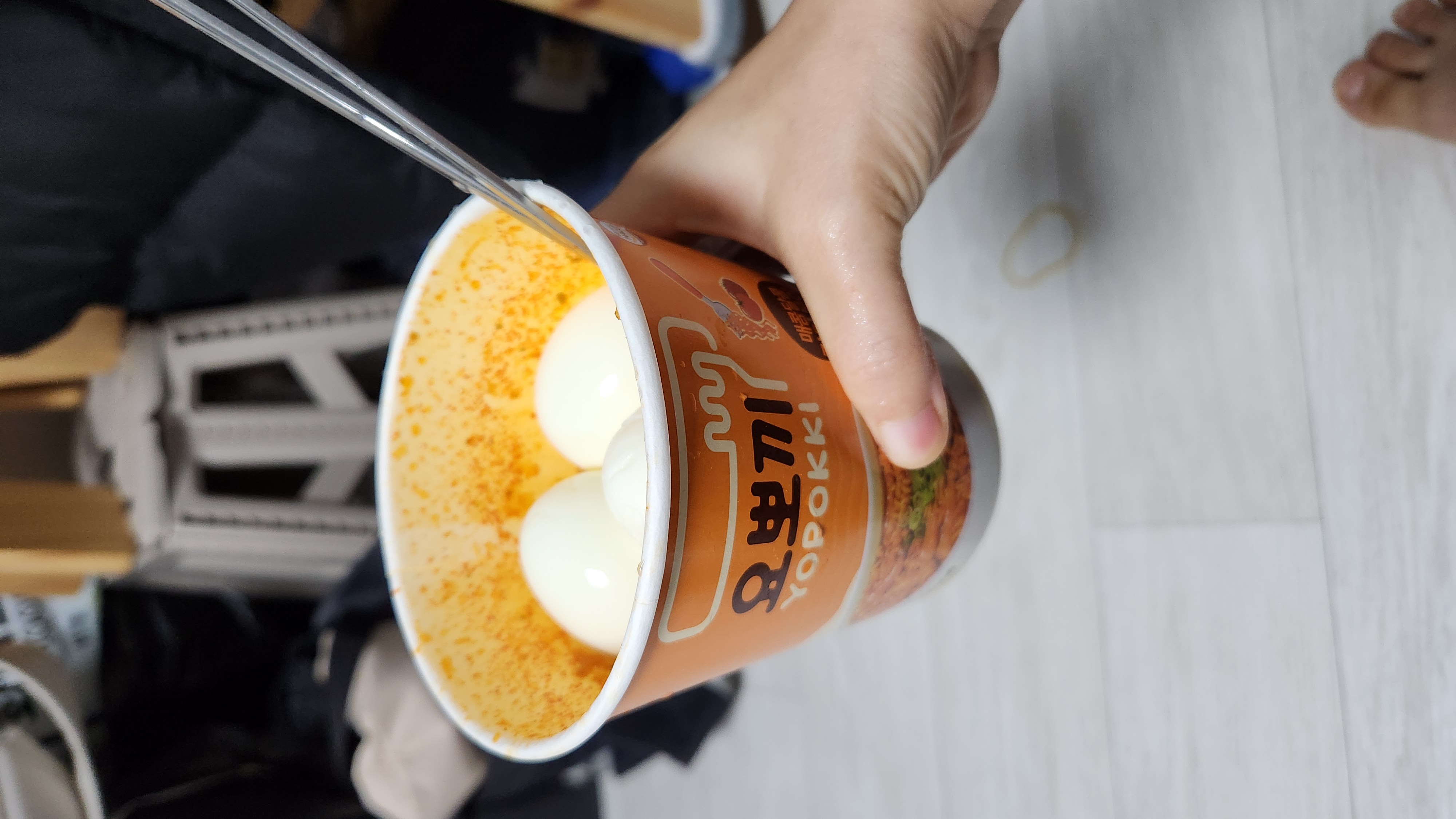 점심겸저녁 컵라볶이, 삶은계란, 과자, 밀크티