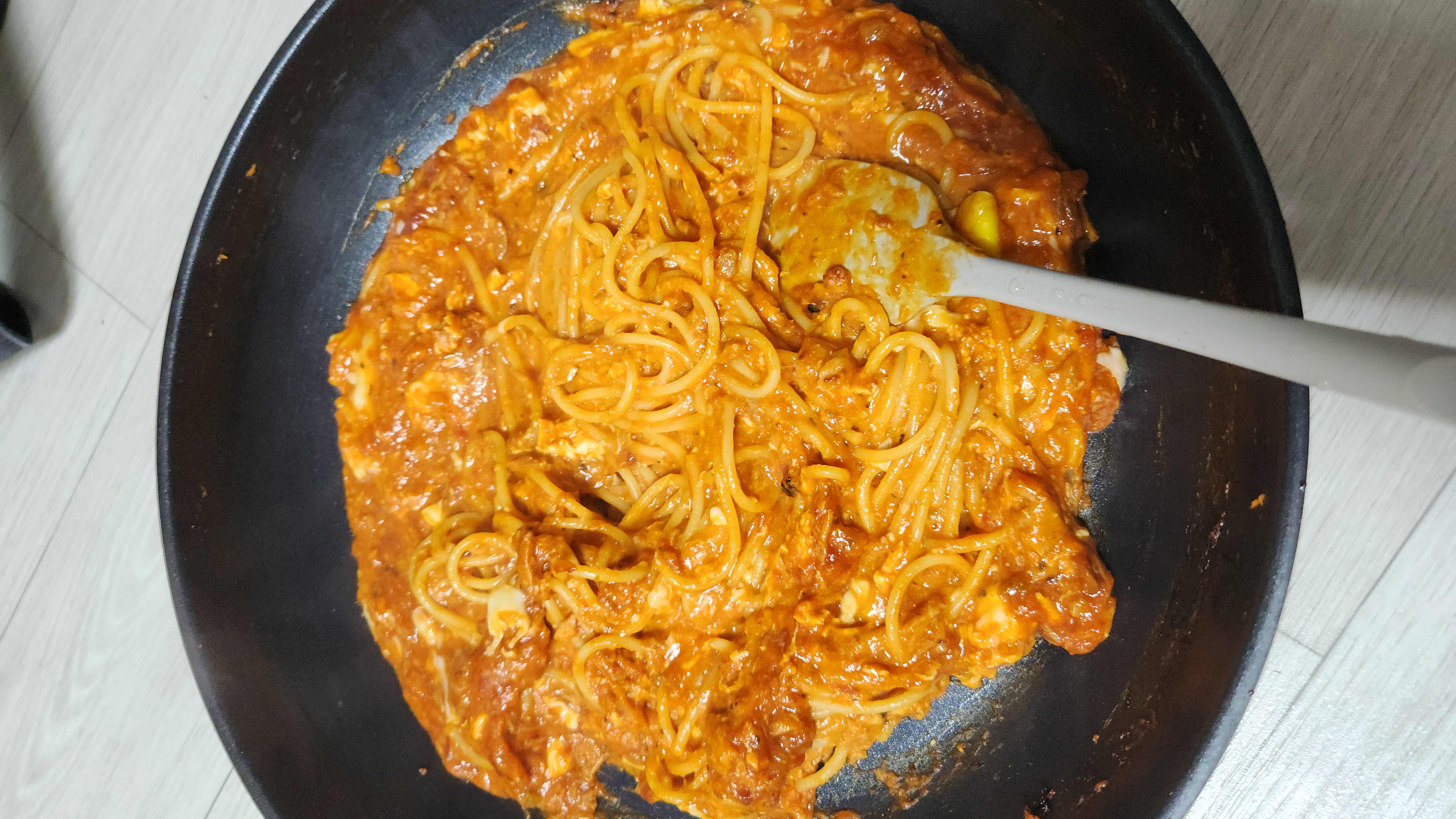 저녁 토마토계란참치파스타, 남은소스에 밥 비벼먹었다. 우유, 요구르트.