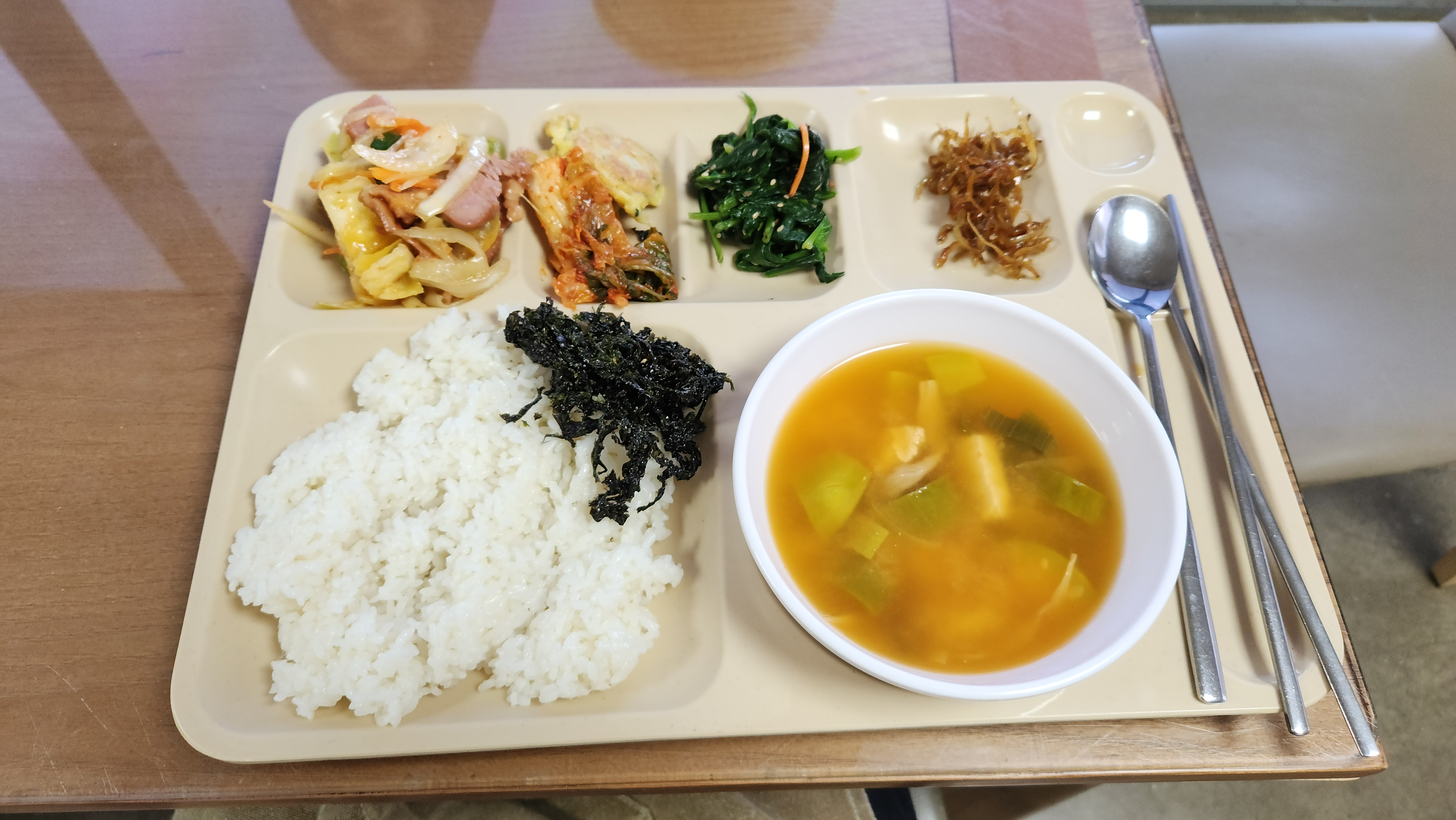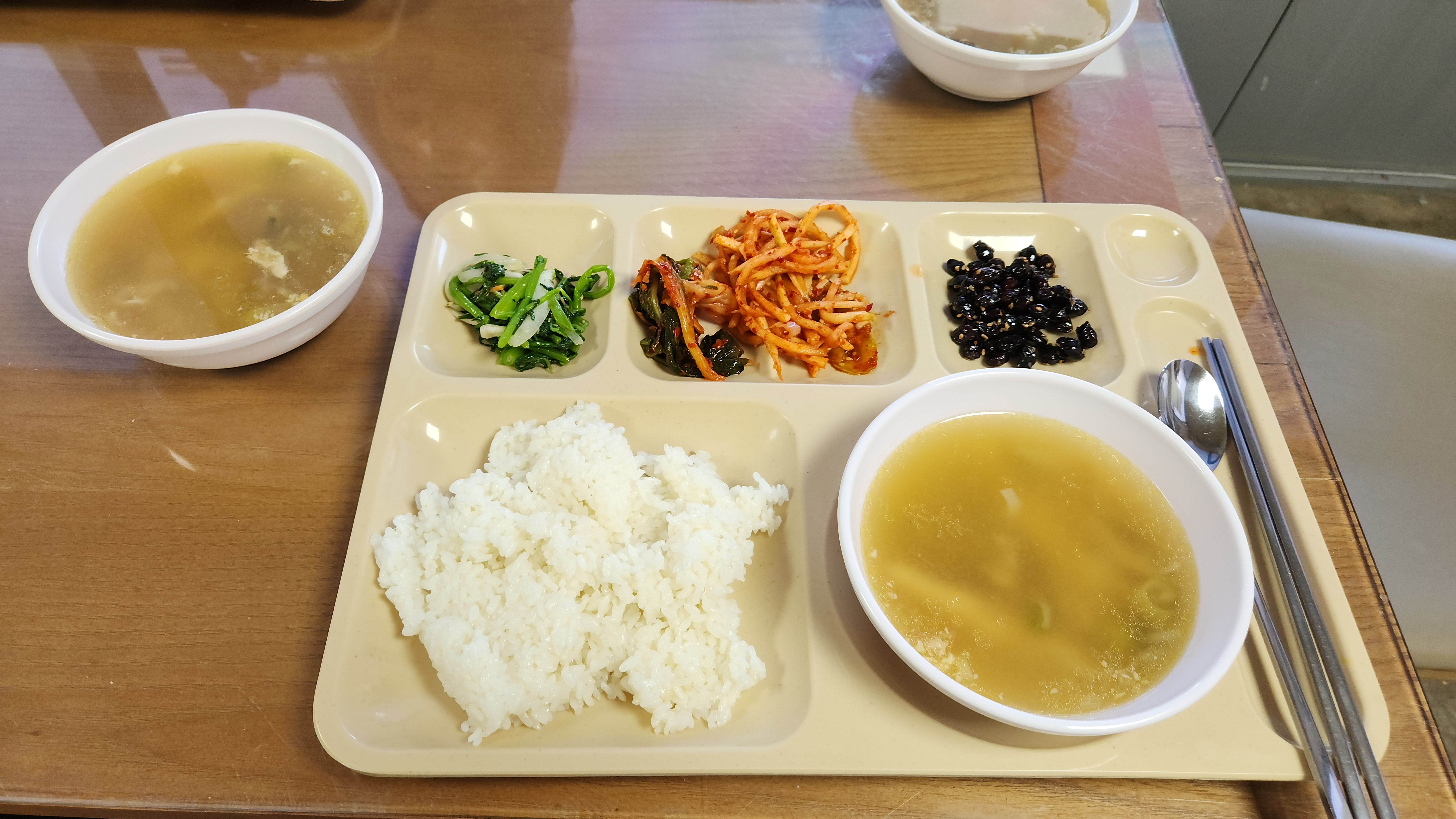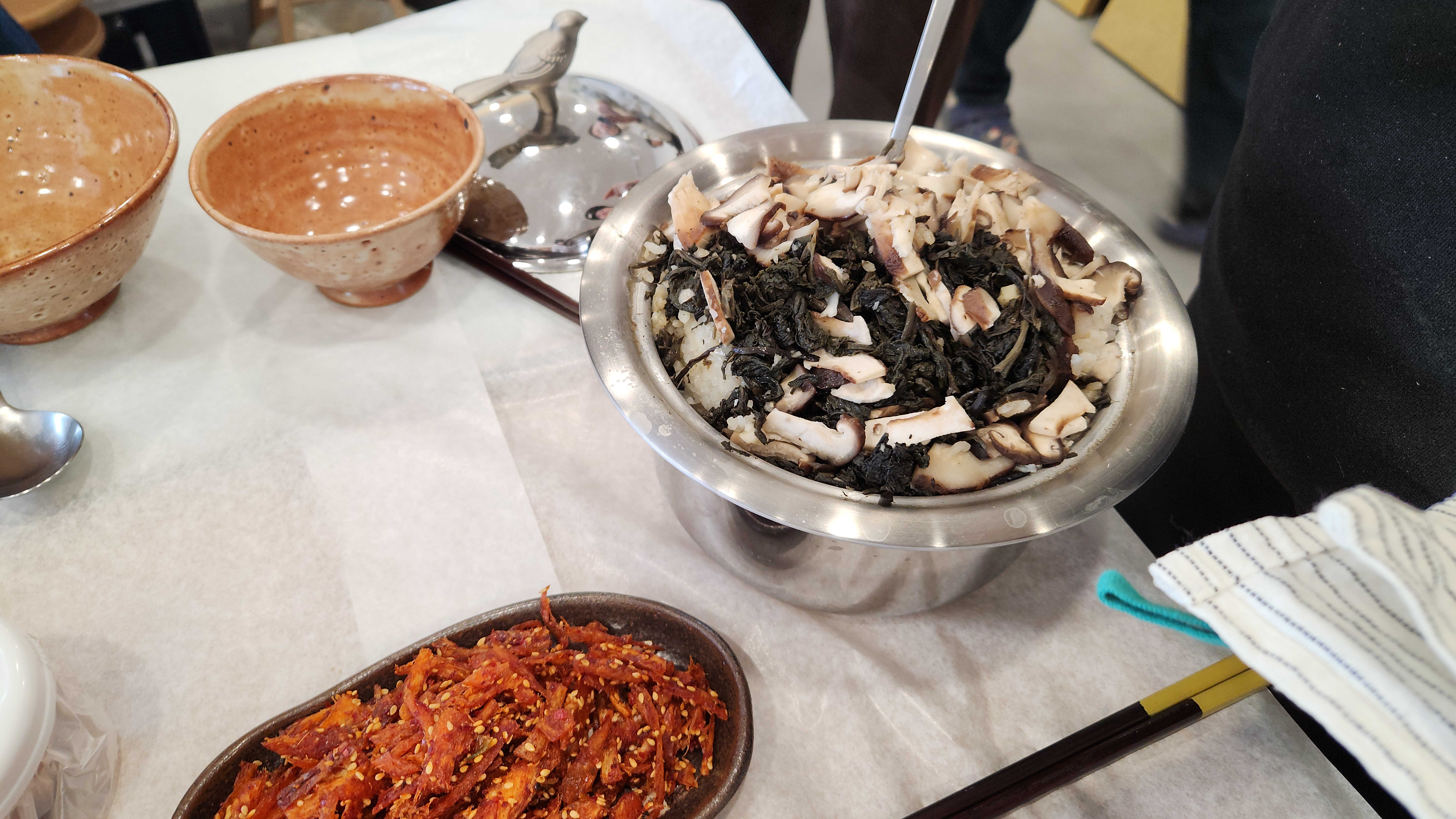 점심 곤드레버섯솥밥, 반찬, 믹스커피