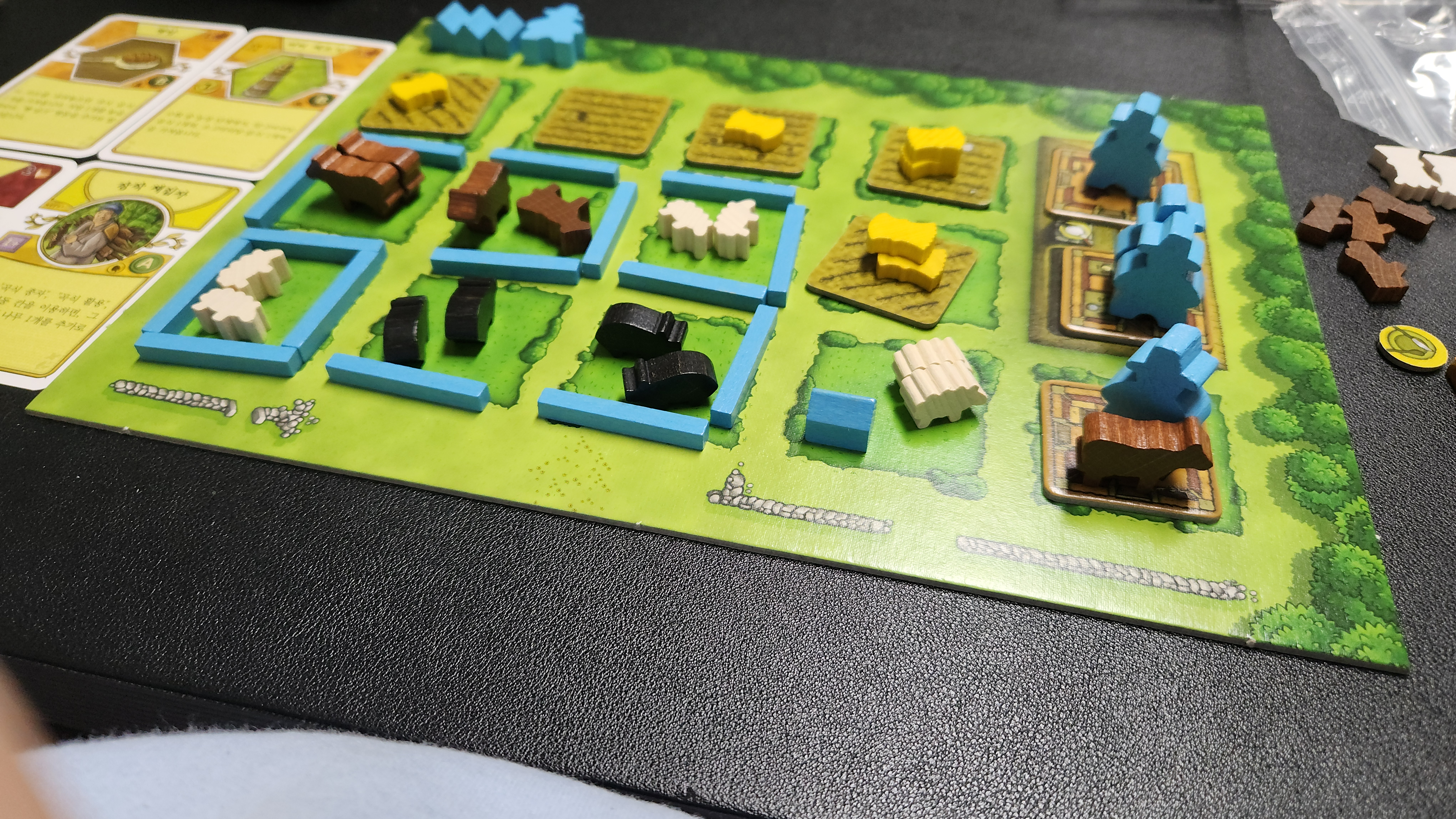 밭갈고 씨뿌리고, 목장 지어 동물키우고, 집지어 일꾼도 들인다. 2~3라운드 마다 수확시기가 온다. 이때 일꾼들에게 식량을 주지 못하면 마이너스점수!