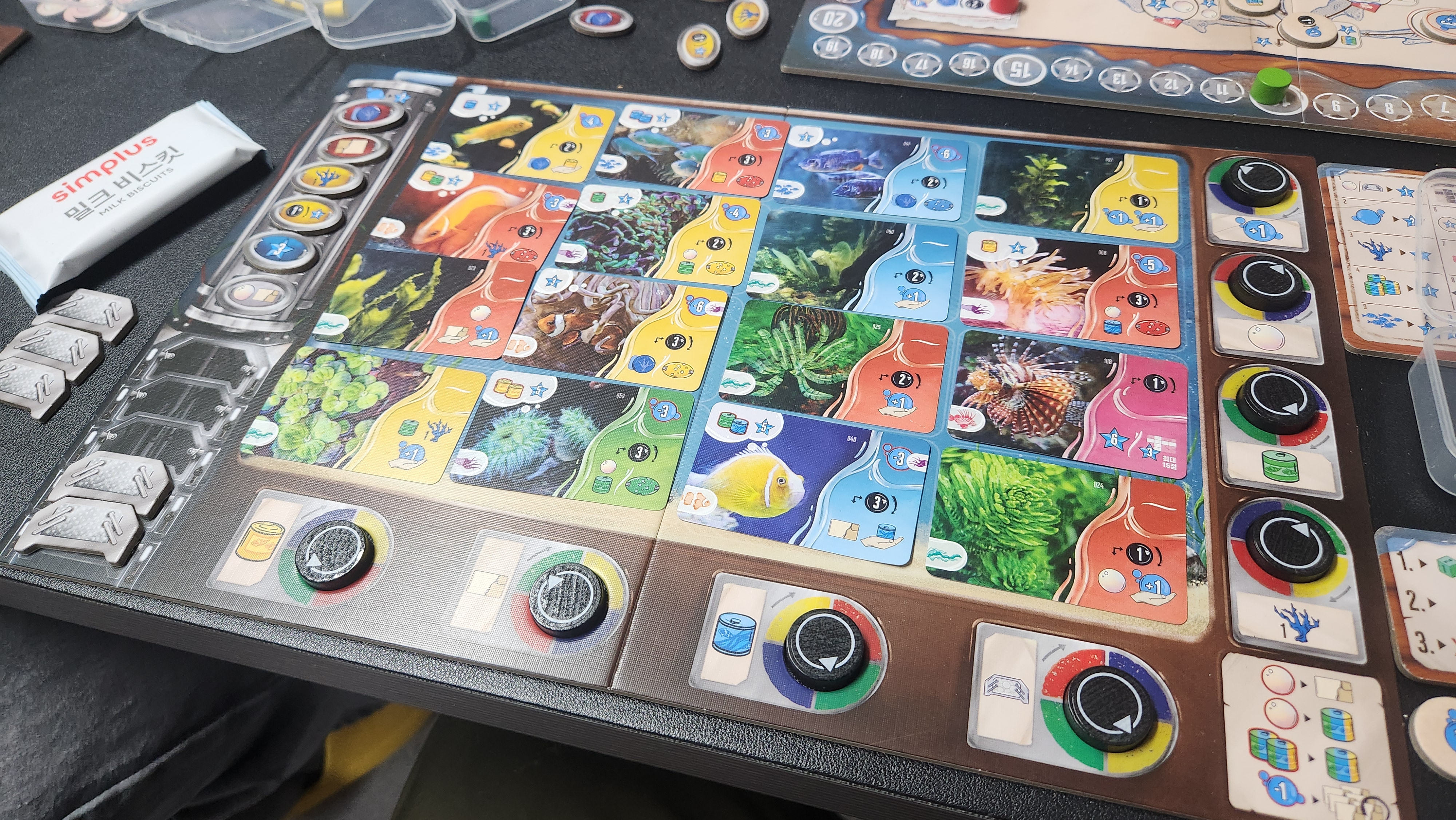 마지막 라운드 마지막 액션에서 수족관 가득채우기 성공! 배치점수 같은거 신경 안쓰고 무지성 채우기 였지만 만족했다ㅎㅎ